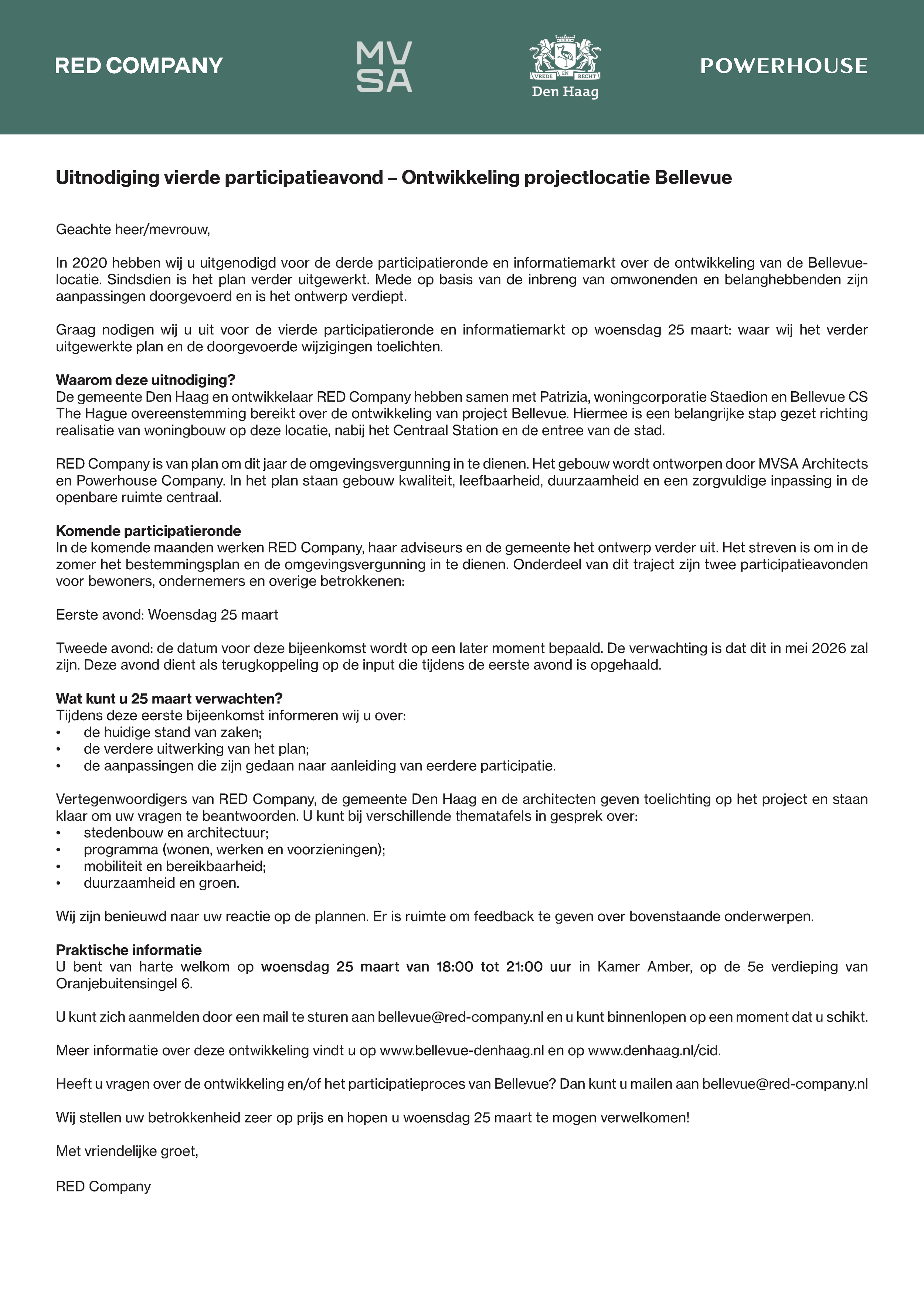 De gemeente Den Haag en RED Company werken samen met projectpartners aan de doorontwikkeling van Bellevue: een nieuw gemengd stedelijk project aan de Bezuidenhoutseweg, vlak bij het Centraal Station en de entree van de stad. In de komende periode wordt het ontwerp verder uitgewerkt, samen met de omgeving.